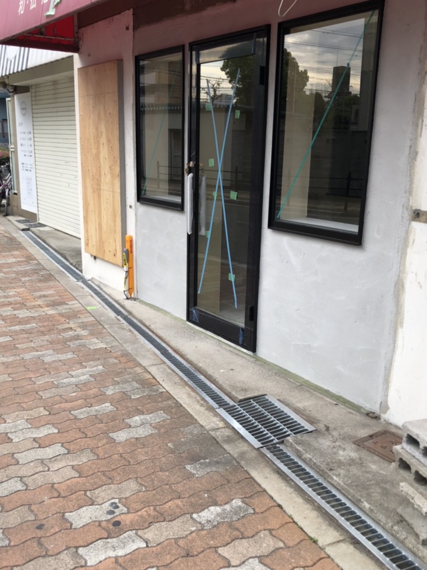 扉前のU字溝にグレーチングを新設しました。 扉横の壁は左官工事を行いました。