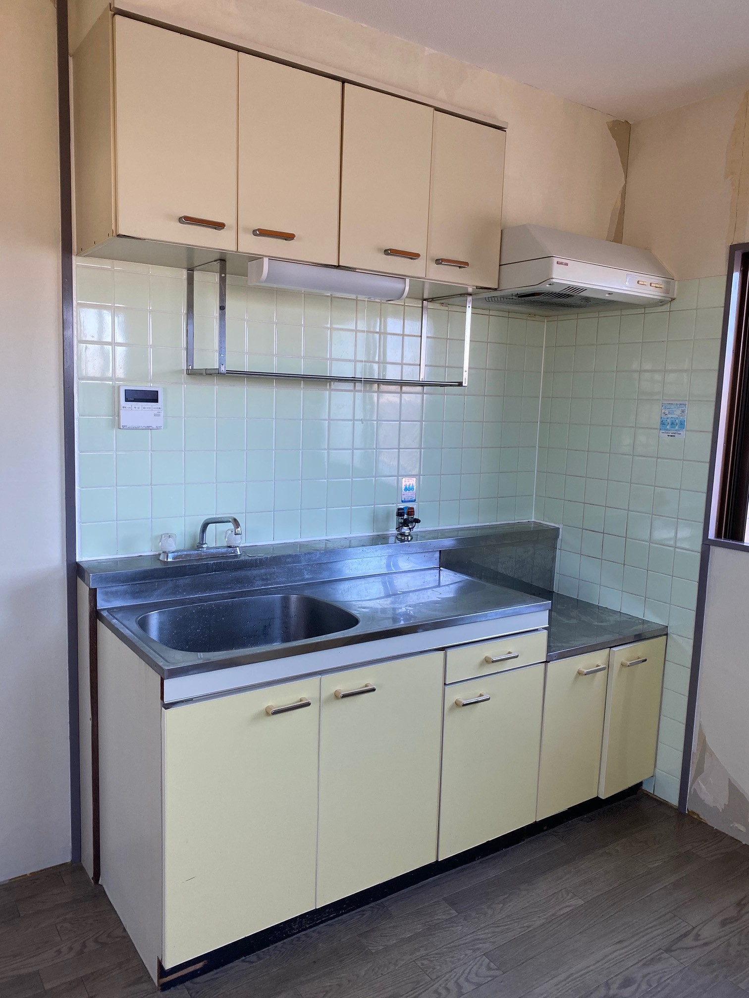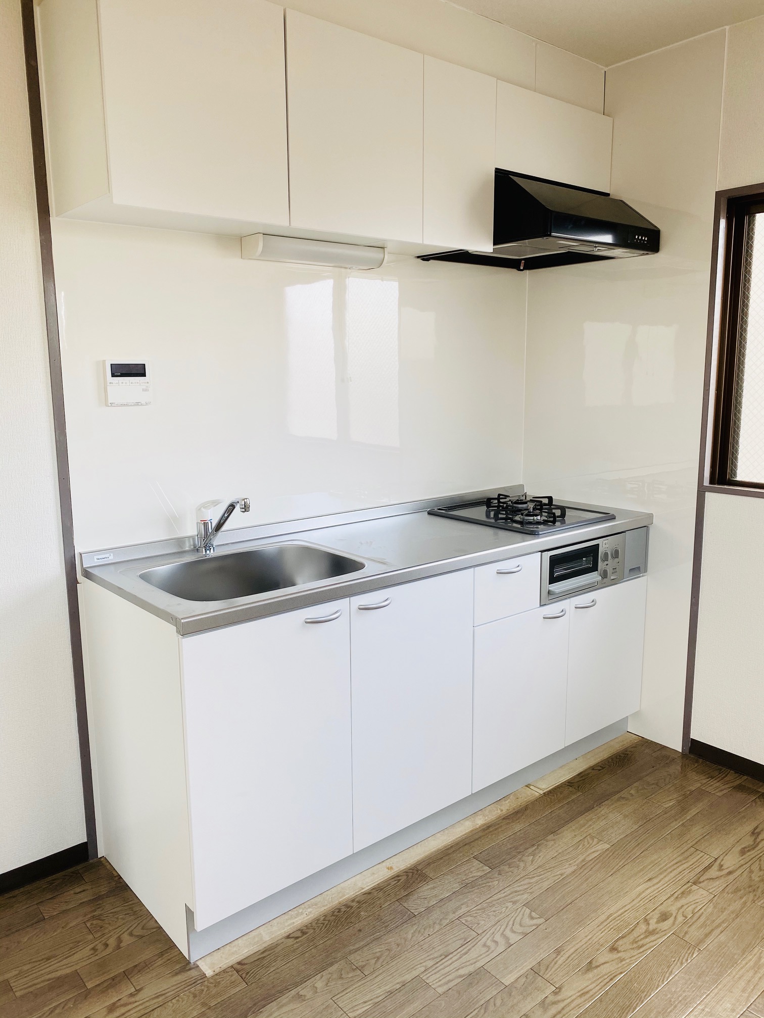 既存のキッチンをシステムキッチンに入れ替えました。 後ろの壁をタイルから白にし、統一感を出しました。 お部屋が明るい印象になりました。