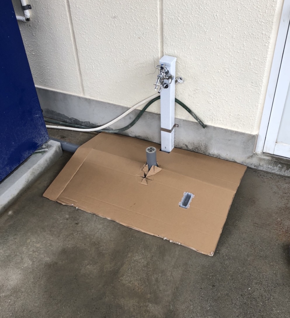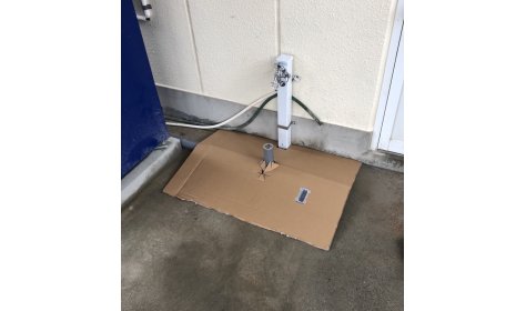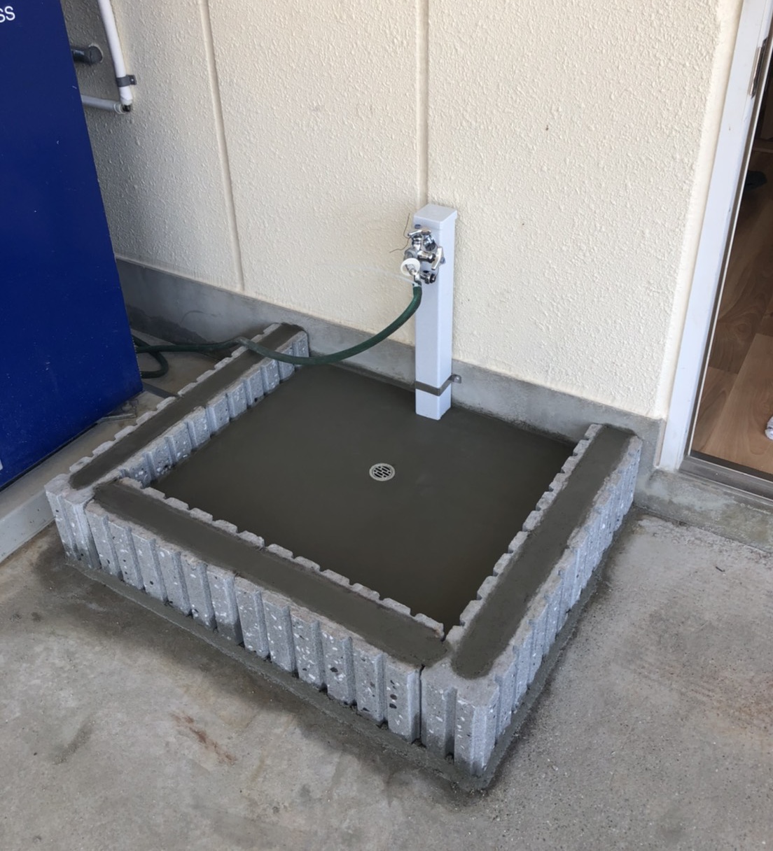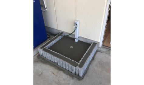 事務所出入口横の立水栓、洗い場設置工事です。 手洗いや外からの砂や汚れを中に持ち込まないために 出入口近くに設置をご希望でした。 ご自宅などでは洗車や小さなお子様の手洗い場としても便利です! 最終乾燥させ、完成です。