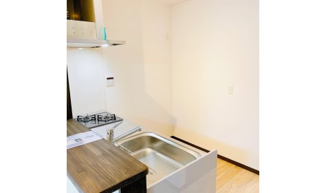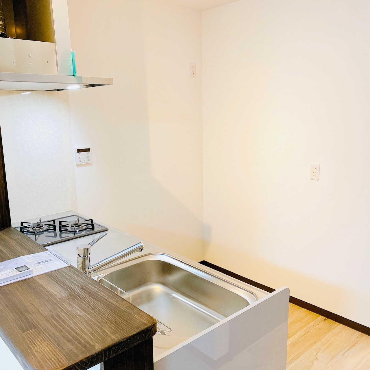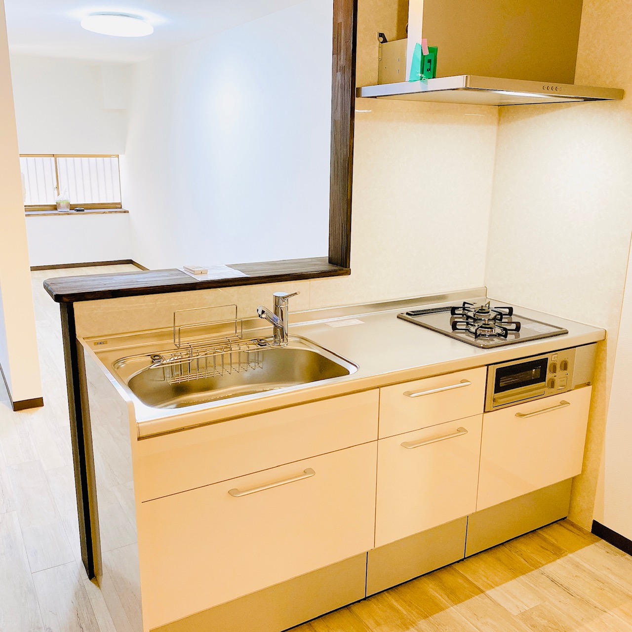 長屋住宅リフォームのキッチン部分です。 キッチンは対面式にし、部屋からは調理部分が見えないようになっています。また冷蔵庫や食器棚などを置くスペースを広めに設け、お部屋はすっきりして見えるような造りになっています。 キッチン下収納もしっかりあり、今回は白を基調としたお部屋にあうキッチンスペースをイメージしました!