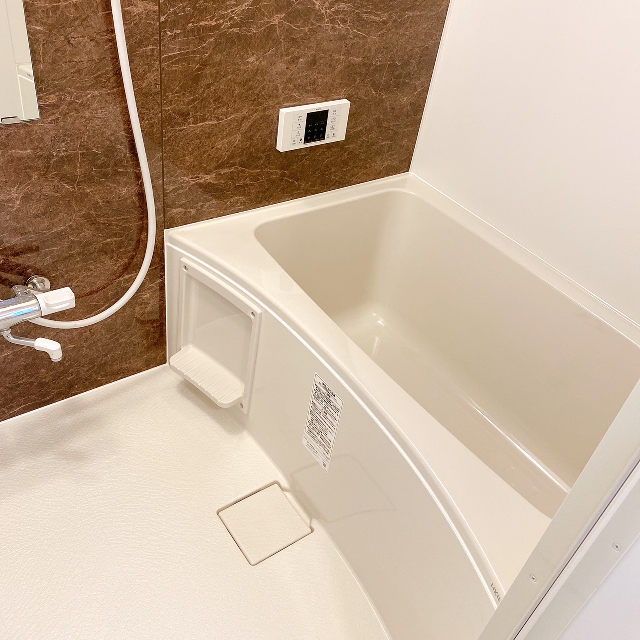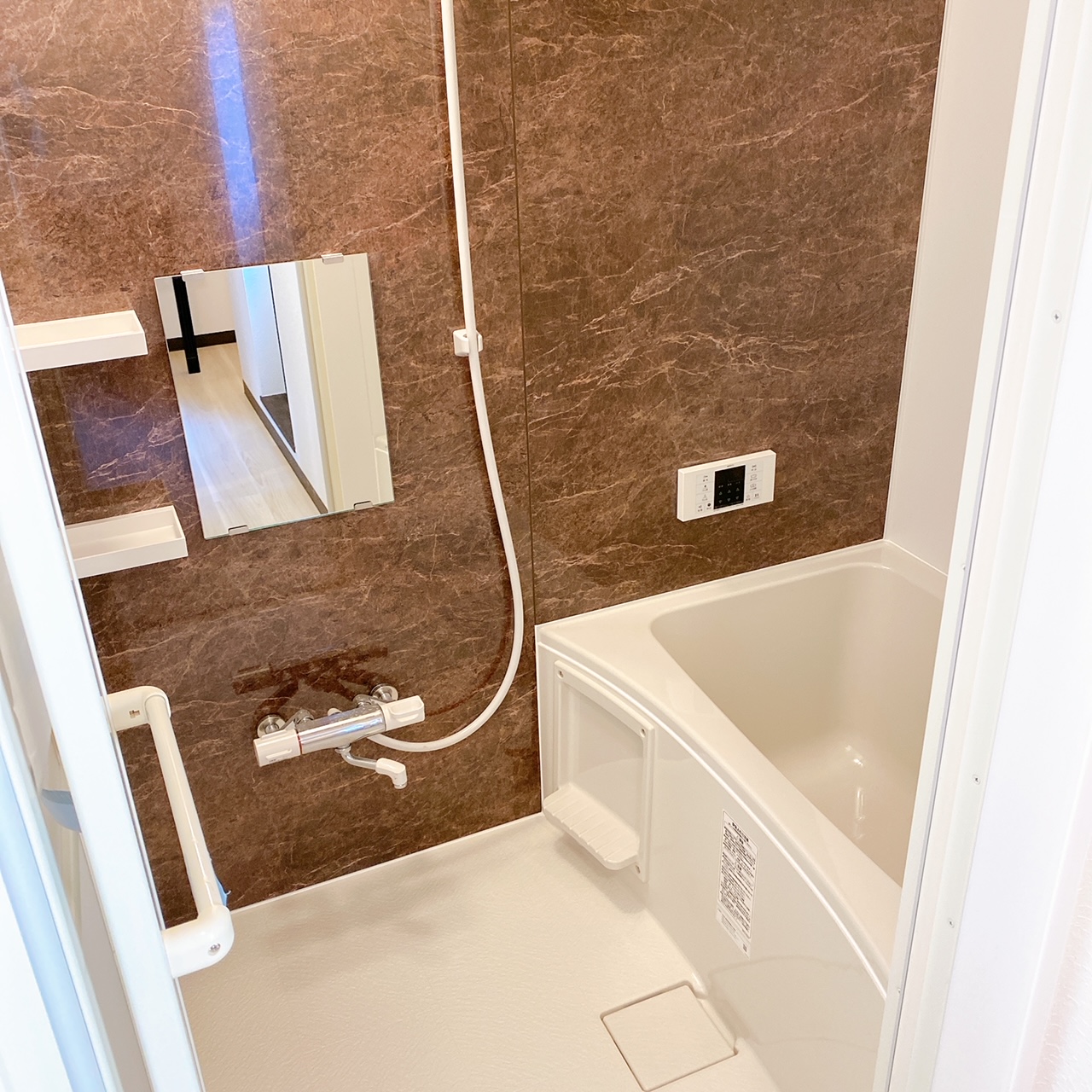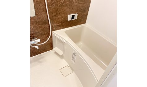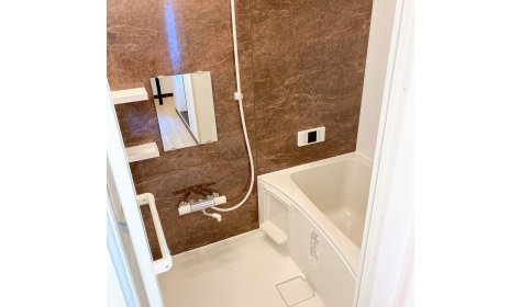 長屋住宅リフォーム工事のバス部分になります。 既存のバスはない状態からの新設になります。ゆったり浸かれる浴槽を設置し壁にはシャンプーなどを置いていただける棚を備え付けています。 シャワーヘッドの高さも2段階調節していただけます。 細かい部分はご希望に合わせてご相談いただけます。